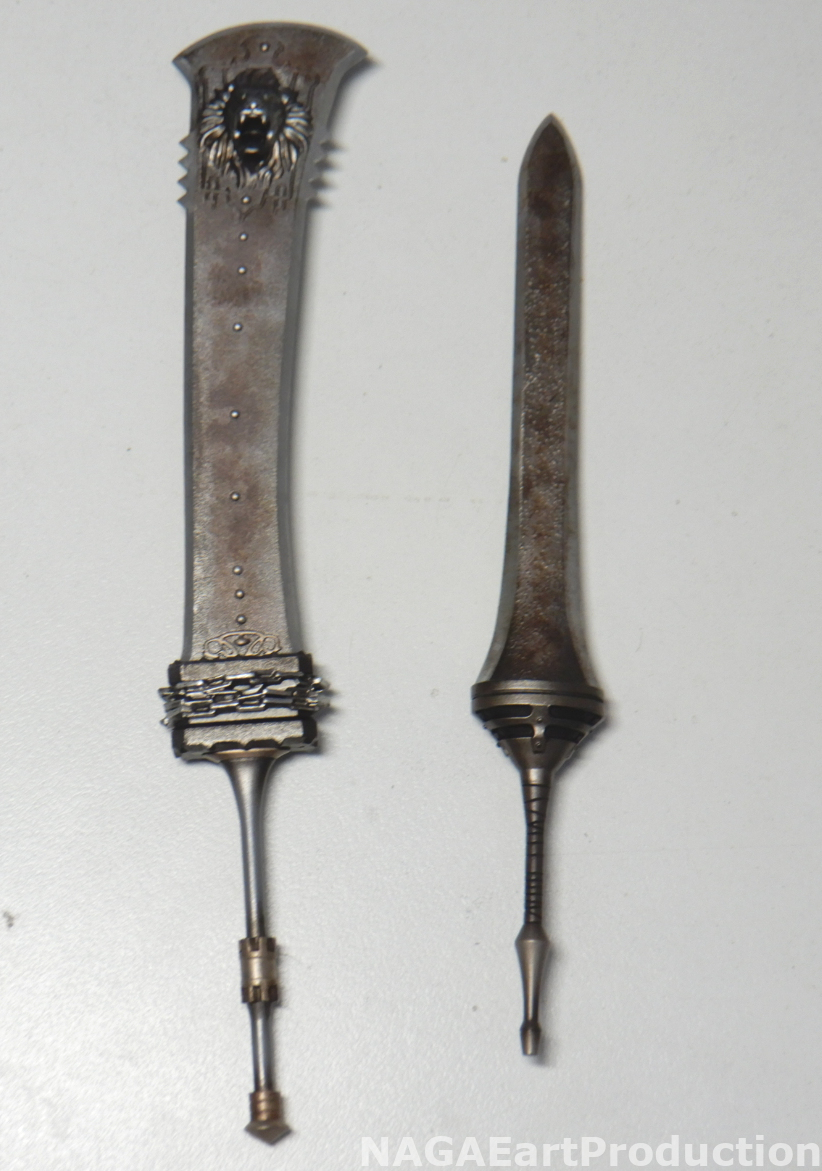 全体に入っていたパーティングラインを消し、こちらもゲーム画像を参考にフルリペイントしています。出来るだけ重々しく本物の金属に見える様に、特に剣の錆表現は拘って塗装しています。